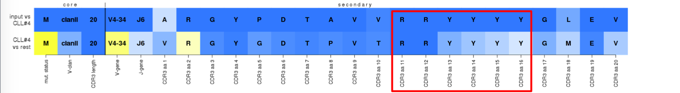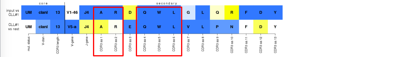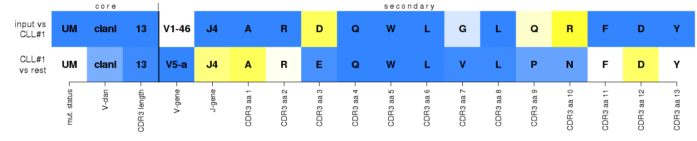 Two-row heat maps display the core and secondary sequence features that were evaluated, and their contributions and significance for assigning select IG gene rearrangements to major CLL subsets. The top row refers to the submitted rearrangement, and the bottom row to the theoretical rearrangement that would have achieved the highest score for every feature in the respective subset - its 'best member'. Regarding the yellow-to-white-to-blue color scale: for the submitted rearrangement on the top row, it reflects the support of the observed values against the support for the values of the 'best member' within the assigned subset; for the 'best member' on the bottom row, it reflects the increasing level of uniqueness of the value within the assigned subset against the 'pool' cohort, thus essentially highlighting subset-distinctive features. Below you'll find some more specific examples, with more detailed explanations about what you see and why, and how to possibly interpret similar results.