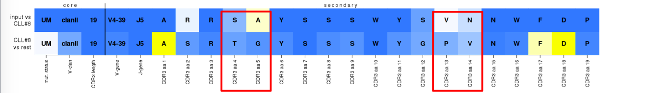 ^True assignment to subset #8. An example of a 'mainly-germline' type of stereotypy, implied by the lighter blue color of the majority of VH CDR3 positions on the bottom row. The assigned sequence follows most of the 'best-member' features with few exceptions in the apparently 'junctional' VH CDR3 positions.