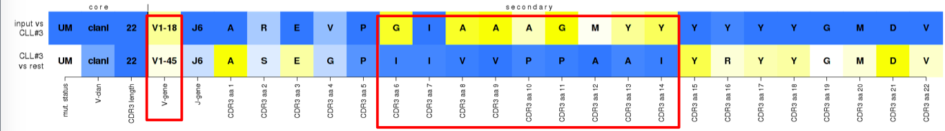 1. relative frequency of IGHV and IGHJ genes, especially relevant in subsets with rearrangements that express more than one IGHV gene (prime example is subset #1) and in which not all IGHV genes are equally represented;