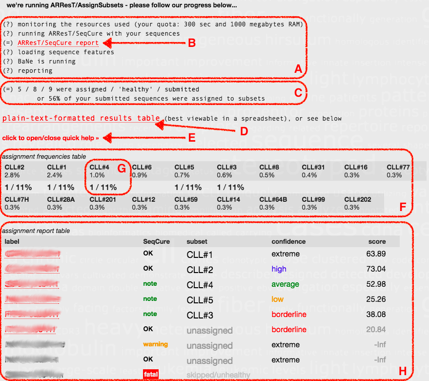 After you launch ARResT/AssignSubsets, you'll be kept updated and presented with information and help, results and tables - please click on the screenshot below to get a larger version, and read below it for an explanation of all the different highlighted sections: