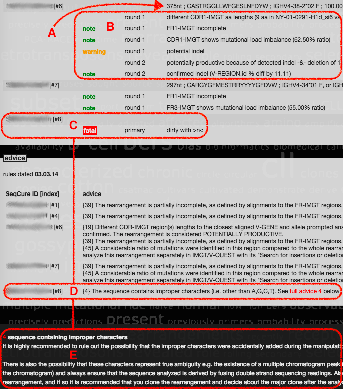 B. Issues discovered by ARResT/SeqCure through IMGT/V-QUEST annotation and application of expert rules, including a colour-coded message level (the same you see in ARResT/AssignSubsets' 'assignment report table' (H above)). Note that this sequence had a potential indel which guided ARResT/SeqCure to rerun IMGT/V-QUEST with its indel mode activated on to confirm it, which it did.